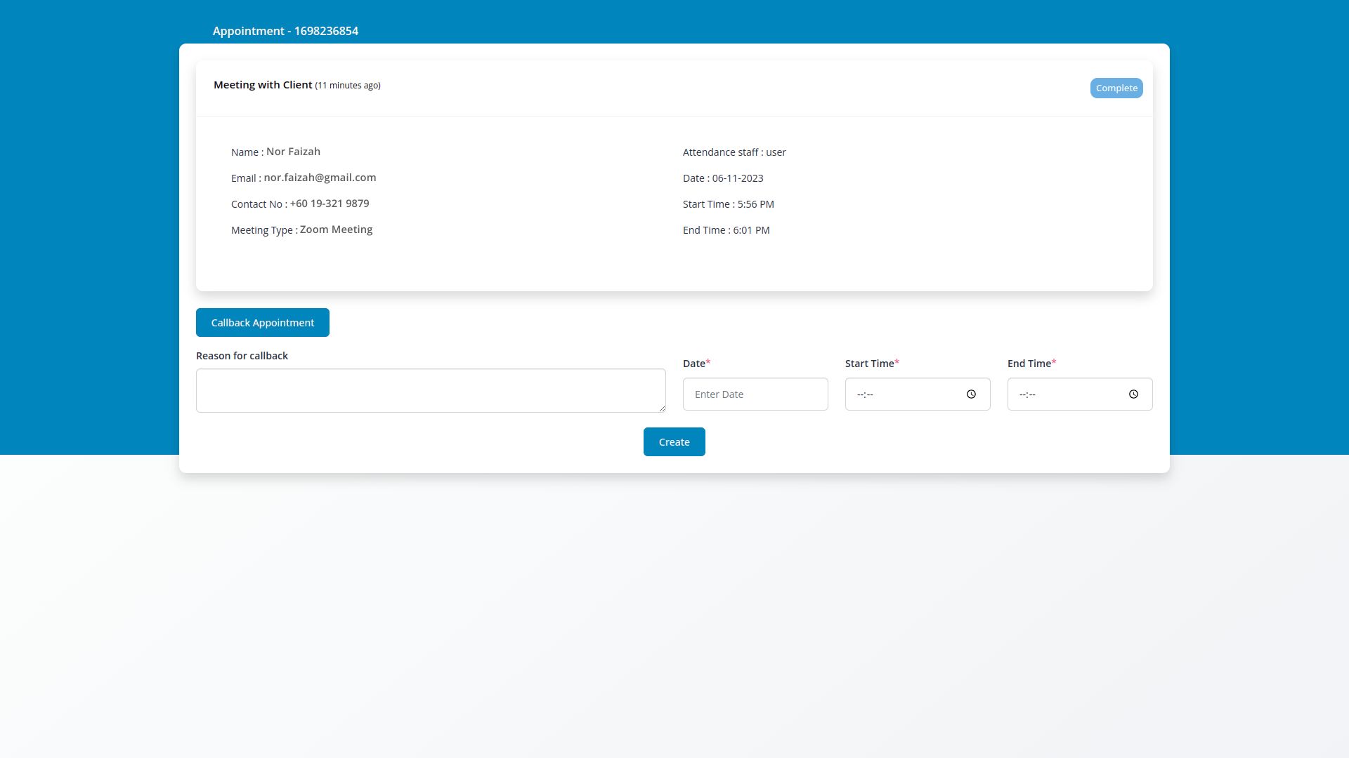 Our intuitive appointment scheduling system streamlines the management process, enabling efficient organization, tracking, and optimization for both business and personal use. Key features include a user-friendly dashboard, calendar integration, customizable color options, meeting type selection, appointment cancellation form, callback request form, post-appointment feedback form, and a copy-link button for easy sharing and submission. Users can effortlessly create and update appointments, ensuring seamless and efficient scheduling tailored to their needs.