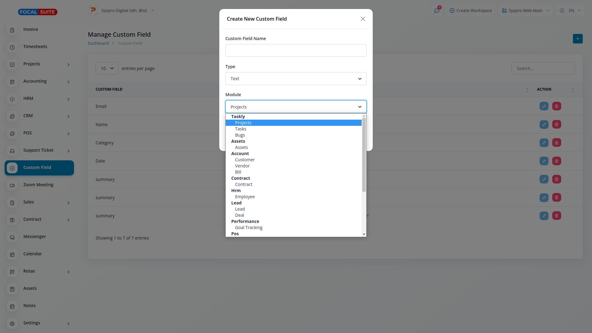Custom fields can be used across various modules, including HRM, Accounts, Leads, Assets, Contracts, Performance, POS, Retainer, Sales, and Taskly. With custom fields, you can collect additional information for any module as needed.